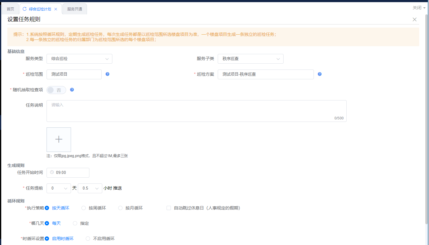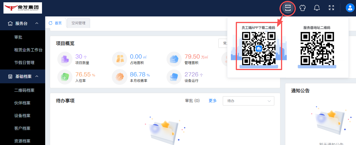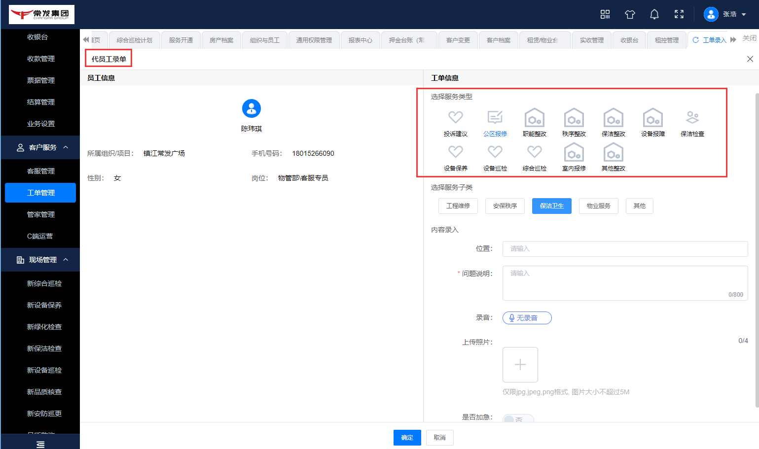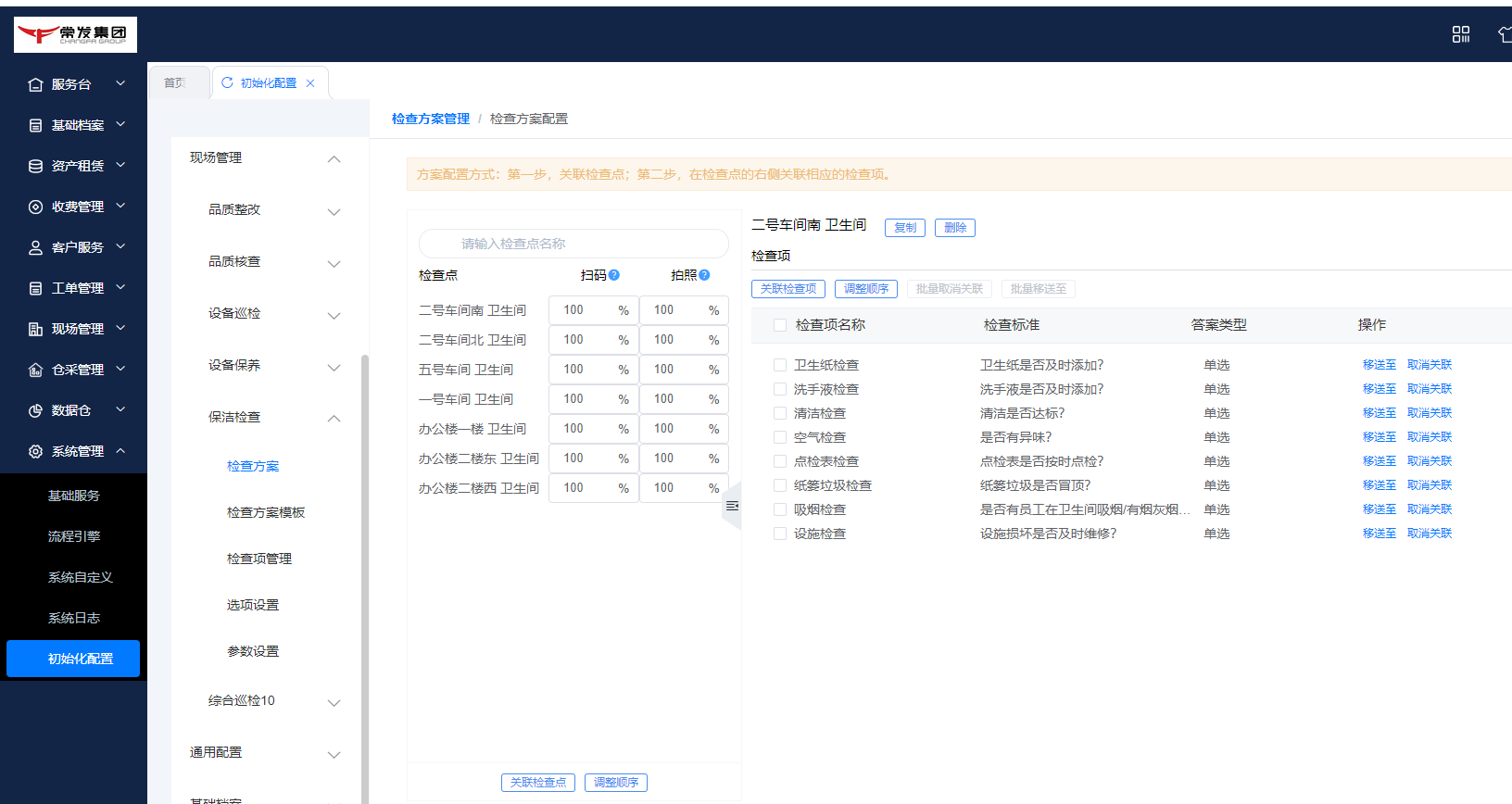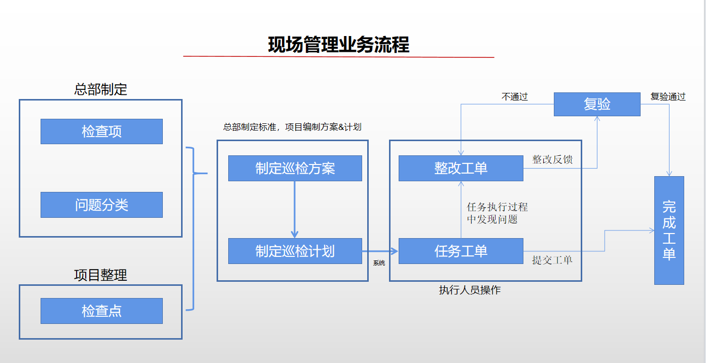 ## 一、系统登录 ### 1. 软件PC登录: 登录地址:[https://sy.changfadc.net/](https://sy.changfadc.net/roc-component-workbench/#/login) 系统环境:建议使用谷歌浏览器登录,谷歌浏览器官方下载地址https://www.google.cn/chrome/index.html 账号信息:用户名(员工编号/手机号),密码:s123456(初始密码) ### 2. 员工APP登录: APP下载地址:PC登录后扫描顶部APP二维码进行下载; 注:APP版本随着系统版本每月会更新,如手机APP没有自动更新请从新扫码下载; 安卓手机存在不同手机型号显示不同安全预警提示,忽略点击继续安装即可; 苹果手机首次安装时,需要进行软件授权认证后才可正常运行软件;  #### 2.1 安卓安装步骤: 使用微信扫描下载二维码后,点击显示界面右上角…,选择使用浏览器打开; 2、点击下载安装,如果有显示多个下载按键则选择日期最新的版本; 3、根据手机提示点击下载; 4、安装前需要对系统的网络、通知、拍照、位置、照片、文件等进行授权; 5、如出现安全提示,则点击继续安装;  #### 2.2 苹果手机安装步骤: 下载安装步骤与安卓一致,下为软件信任验证授权步骤; 1、点击设置,找到通用——设备管理(不同型号可能名称有所差异); 2、选择“Shenzhen Siyuan Computer Software Co.,Ltd.”; 3、点击“信任“Shenzhen Siyuan Computer Software Co.,Ltd.””; 4、出现弹窗后点击信任即可;  #### 2.3 APP登录: **服务器地址为:sy.changfadc.net**  ## 二、数据初始化 ### 1. 空间档案 #### (1)空间区域、空间分类维护 维护路径:系统管理→初始化配置→基础档案→空间档案→空间区域(空间分类) 空间区域已经做设置,如果有新的分类,可以在初始化配置中添加;  空间区域是所有项目公用分类,如果目前分类中都不满足,可以在初始化配置中添加;  #### (2) 空间档案维护 维护路径:基础档案→空间管理 空间支持单个新增,也支持整理表格导入;批量导入下载模板,按模板要求整理即可导入;   ### 2. 检查项(总部统一维护) #### (1) 检查项分类 维护路径:系统管理→初始化配置→现场管理→保洁检查→检查项设定;  #### (2)检查项 维护路径:系统管理→初始化配置→现场管理→保洁检查→检查项设定; 检查项支持批量导入,也支持单个添加; 后续项目使用过程中,发现检查项需要新增,则联系总部信息部; ### 3. 巡检方案 #### (1) 巡检方案设置 维护路径:系统管理→初始化配置→现场管理→保洁检查→检查方案;  #### (2)巡检方案导入 巡检方案创建完成后,进行方案配置,点击【配置方案】进入配置界面; 配置方案支持手工界面配置,也支持批量导入; 注:批量导入请下载最新的模板进行数据整理;   ## 三、二维码打印 ### 1. 空间二维码打印 报表路径:数据仓→报表中心→空间二维码 通过execl下载系统中二维码报表,可以进行格式微调进行打印粘贴;   ### 2. 设备二维码打印 ## 四、工单计划生成 ### 1. 工单计划设定 操作路径:现场管理→新保洁检查→巡检计划→新建计划; 注:计划命名统一命名规则: 项目名称\+执行部门\+巡检业务; 例如 常州常发广场\-保洁日常巡查   工单计划创建完成后,【设置任务规则】 循环策略:可选按天循环、按周循环、按月循环,默认选中按天循环; (选择不同的执行策略,下方显示不同的制定规则;) 若启用时循环,即每隔几小时生成一个任务工单,一天中当循环至时循环结束时间时即当天不再执行时循环,通过时循环可实现项目一天多巡。 初次设置可以联系信息部或者思源进行指导;  ### 2. 工单任务列表查看 工单创建完成,可以在任务列表中查看工单计划是否设置准确,如有差异可以进行调整更改; 工单会按设定计划时间定时推送,也可以手动推送产生; 注意:工单中相关岗位人员必须要有员工,否在工单无法执行;   ## 五、现场管理工单执行 ### 1. 现场管理业务流程图  ### 2. APP工单监管 可以查看所有工单持中工单信息;   ### 3. 巡检工单  ### 4. 离线工单  ### 5. 整改工单  ## 六、客服报修工单 ### 1. PC工单录入 系统中工单录入分为代客录单、代员工录单; 代客录单,只能录入客服工单,例如:公区报修、室内报修、投诉建议; 代员工录单,除了客服工单以外,现场管理的巡检工单,整改工单均可录入; 操作路径:客户服务→工单管理→工单录入→代客录单、代员工录单;   ### 2. APP工单录入  ### 3. 工单流程 客服工单流程为:提单→客服/营运受理→相关职能部门接单(客服、工程、保洁、秩序)→接单人进行现场维修处理→客服/营运回访; 注:回访不满意需要从新处理工单;  现场管理工单流程为:提单→相关职能部门接单(客服、工程、保洁、秩序)→接单人进行现场处理  整改工单流程为:提单→相关职能部门接单(客服、工程、保洁、秩序)→接单人进行现场维修处理按→提单人进行审核; 注:审核不通过需要从新处理反馈;  ### 4. 客服工单执行