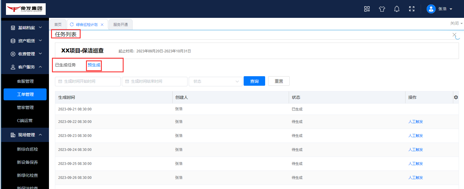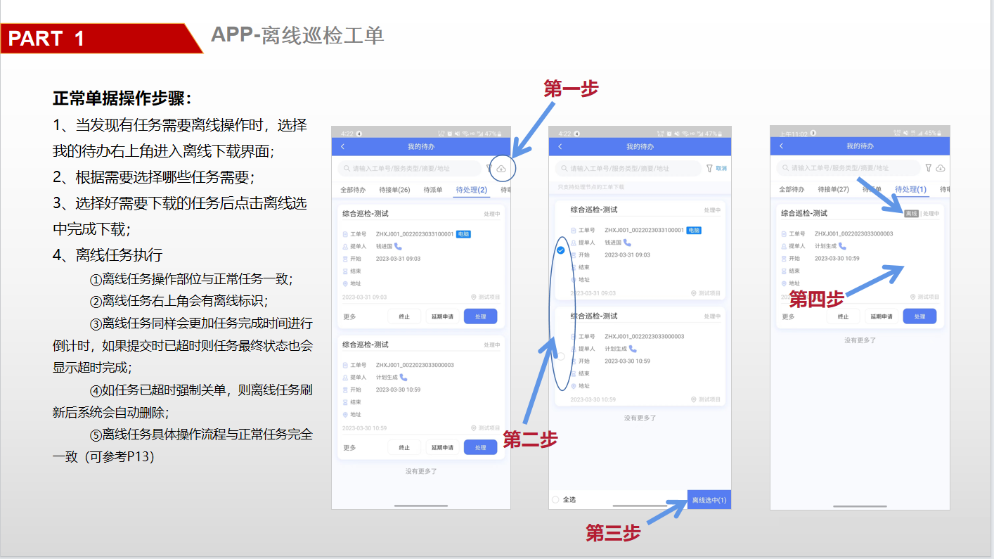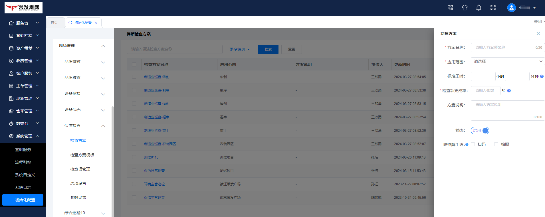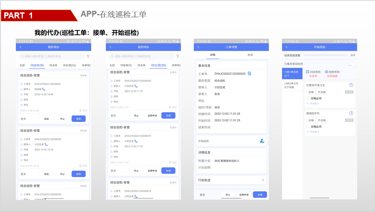 ## 一、系统登录 ### 1. 软件PC登录: 登录地址:[https://sy.changfadc.net/](https://sy.changfadc.net/roc-component-workbench/#/login) 系统环境:建议使用谷歌浏览器登录,谷歌浏览器官方下载地址https://www.google.cn/chrome/index.html 账号信息:用户名(员工编号/手机号),密码:s123456(初始密码) ### 2. 员工APP登录: APP下载地址:PC登录后扫描顶部APP二维码进行下载; 注:APP版本随着系统版本每月会更新,如手机APP没有自动更新请从新扫码下载; 安卓手机存在不同手机型号显示不同安全预警提示,忽略点击继续安装即可; 苹果手机首次安装时,需要进行软件授权认证后才可正常运行软件;  #### 2.1 安卓安装步骤: 使用微信扫描下载二维码后,点击显示界面右上角…,选择使用浏览器打开; 2、点击下载安装,如果有显示多个下载按键则选择日期最新的版本; 3、根据手机提示点击下载; 4、安装前需要对系统的网络、通知、拍照、位置、照片、文件等进行授权; 5、如出现安全提示,则点击继续安装;  #### 2.2 苹果手机安装步骤: 下载安装步骤与安卓一致,下为软件信任验证授权步骤; 1、点击设置,找到通用——设备管理(不同型号可能名称有所差异); 2、选择“Shenzhen Siyuan Computer Software Co.,Ltd.”; 3、点击“信任“Shenzhen Siyuan Computer Software Co.,Ltd.””; 4、出现弹窗后点击信任即可;  #### 2.3 APP登录: **服务器地址为:sy.changfadc.net**  ## 二、数据初始化 ### 1. 空间档案 #### (1)空间区域、空间分类维护 维护路径:系统管理→初始化配置→基础档案→空间档案→空间区域(空间分类) 空间区域已经做设置,如果有新的分类,可以在初始化配置中添加;  空间区域是所有项目公用分类,如果目前分类中都不满足,可以在初始化配置中添加;  #### (2) 空间档案维护 维护路径:基础档案→空间管理 空间支持单个新增,也支持整理表格导入;批量导入下载模板,按模板要求整理即可导入;   ### 2. 检查项(总部统一维护) #### (1) 检查项分类 维护路径:系统管理→初始化配置→现场管理→保洁检查→检查项设定;  #### (2)检查项 维护路径:系统管理→初始化配置→现场管理→保洁检查→检查项设定; 检查项支持批量导入,也支持单个添加; 后续项目使用过程中,发现检查项需要新增,则联系总部信息部; ### 3. 巡检方案 #### (1) 巡检方案设置 维护路径:系统管理→初始化配置→现场管理→保洁检查→检查方案;  #### (2)巡检方案导入 巡检方案创建完成后,进行方案配置,点击【配置方案】进入配置界面; 配置方案支持手工界面配置,也支持批量导入; 注:批量导入请下载最新的模板进行数据整理;   ## 三、二维码打印 ### 1. 空间二维码打印 报表路径:数据仓→报表中心→空间二维码 通过execl下载系统中二维码报表,可以进行格式微调进行打印粘贴;   ### 2. 设备二维码打印 ## 四、工单计划生成 ### 1. 工单计划设定 操作路径:现场管理→新保洁检查→巡检计划→新建计划; 注:计划命名统一命名规则: 项目名称\+执行部门\+巡检业务; 例如 常州常发广场\-保洁日常巡查   工单计划创建完成后,【设置任务规则】 循环策略:可选按天循环、按周循环、按月循环,默认选中按天循环; (选择不同的执行策略,下方显示不同的制定规则;) 若启用时循环,即每隔几小时生成一个任务工单,一天中当循环至时循环结束时间时即当天不再执行时循环,通过时循环可实现项目一天多巡。 初次设置可以联系信息部或者思源进行指导;  ### 2. 工单任务列表查看 工单创建完成,可以在任务列表中查看工单计划是否设置准确,如有差异可以进行调整更改; 工单会按设定计划时间定时推送,也可以手动推送产生; 注意:工单中相关岗位人员必须要有员工,否在工单无法执行;   ## 五、现场管理工单执行 ### 1. 现场管理业务流程图  ### 2. APP工单监管 可以查看所有工单持中工单信息;   ### 3. 巡检工单  ### 4. 离线工单  ### 5. 整改工单  ## 六、客服报修工单 ### 1. PC工单录入 系统中工单录入分为代客录单、代员工录单; 代客录单,只能录入客服工单,例如:公区报修、室内报修、投诉建议; 代员工录单,除了客服工单以外,现场管理的巡检工单,整改工单均可录入; 操作路径:客户服务→工单管理→工单录入→代客录单、代员工录单;   ### 2. APP工单录入  ### 3. 工单流程 客服工单流程为:提单→客服/营运受理→相关职能部门接单(客服、工程、保洁、秩序)→接单人进行现场维修处理→客服/营运回访; 注:回访不满意需要从新处理工单;  现场管理工单流程为:提单→相关职能部门接单(客服、工程、保洁、秩序)→接单人进行现场处理  整改工单流程为:提单→相关职能部门接单(客服、工程、保洁、秩序)→接单人进行现场维修处理按→提单人进行审核; 注:审核不通过需要从新处理反馈;  ### 4. 客服工单执行