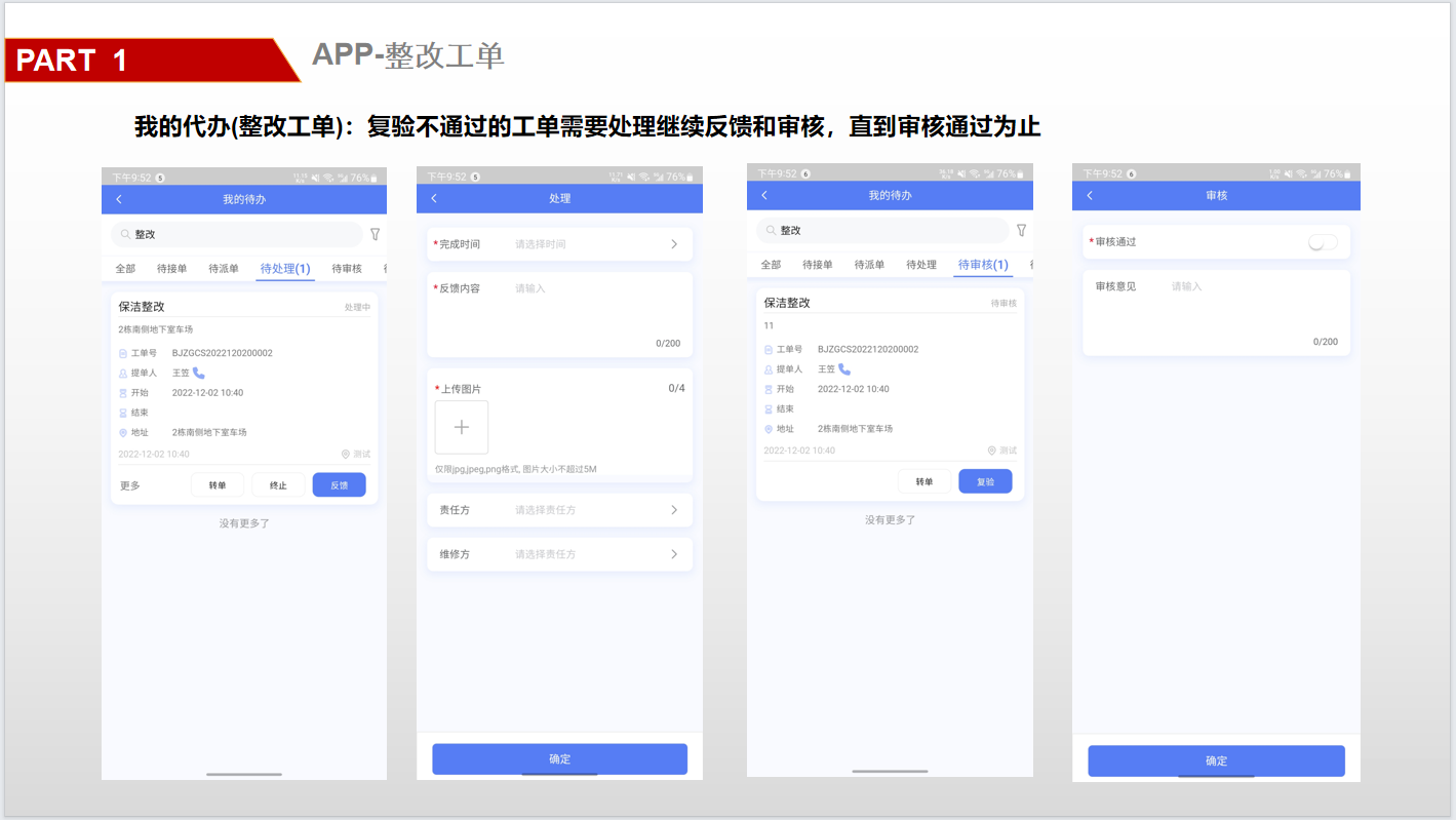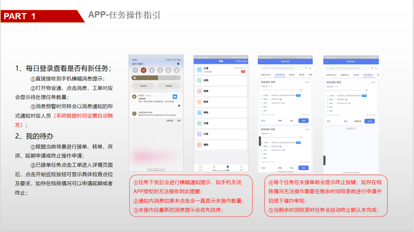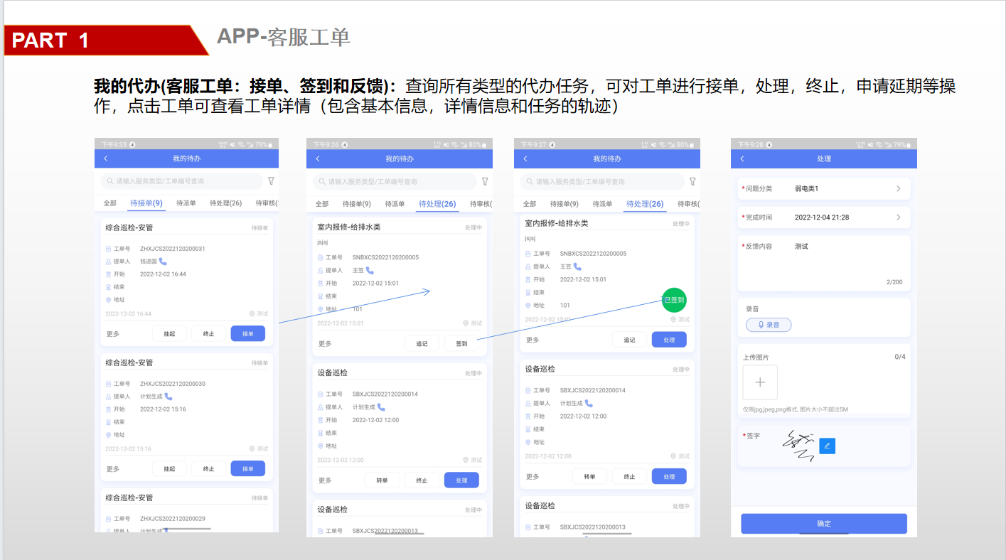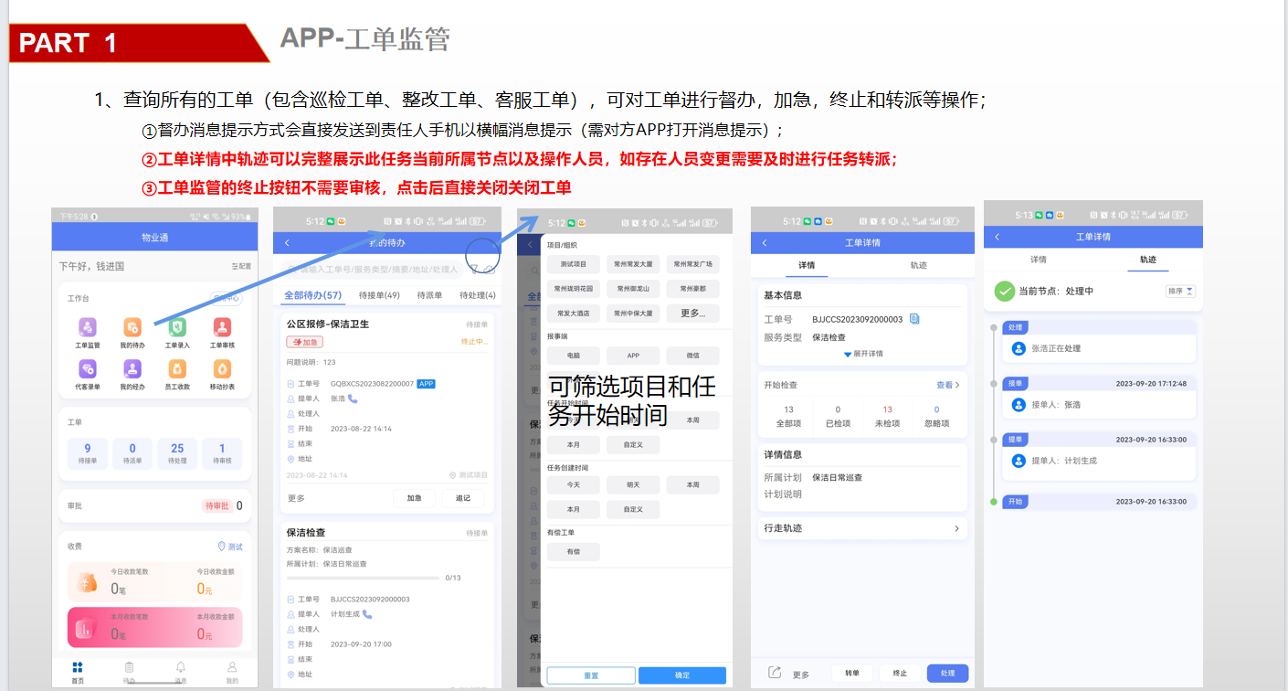 ## 一、系统登录 ### 1. 软件PC登录: 登录地址:[https://sy.changfadc.net/](https://sy.changfadc.net/roc-component-workbench/#/login) 系统环境:建议使用谷歌浏览器登录,谷歌浏览器官方下载地址https://www.google.cn/chrome/index.html 账号信息:用户名(员工编号/手机号),密码:s123456(初始密码) ### 2. 员工APP登录: APP下载地址:PC登录后扫描顶部APP二维码进行下载; 注:APP版本随着系统版本每月会更新,如手机APP没有自动更新请从新扫码下载; 安卓手机存在不同手机型号显示不同安全预警提示,忽略点击继续安装即可; 苹果手机首次安装时,需要进行软件授权认证后才可正常运行软件;  #### 2.1 安卓安装步骤: 使用微信扫描下载二维码后,点击显示界面右上角…,选择使用浏览器打开; 2、点击下载安装,如果有显示多个下载按键则选择日期最新的版本; 3、根据手机提示点击下载; 4、安装前需要对系统的网络、通知、拍照、位置、照片、文件等进行授权; 5、如出现安全提示,则点击继续安装;  #### 2.2 苹果手机安装步骤: 下载安装步骤与安卓一致,下为软件信任验证授权步骤; 1、点击设置,找到通用——设备管理(不同型号可能名称有所差异); 2、选择“Shenzhen Siyuan Computer Software Co.,Ltd.”; 3、点击“信任“Shenzhen Siyuan Computer Software Co.,Ltd.””; 4、出现弹窗后点击信任即可;  #### 2.3 APP登录: **服务器地址为:sy.changfadc.net**  ## 二、数据初始化 ### 1. 空间档案 #### (1)空间区域、空间分类维护 维护路径:系统管理→初始化配置→基础档案→空间档案→空间区域(空间分类) 空间区域已经做设置,如果有新的分类,可以在初始化配置中添加;  空间区域是所有项目公用分类,如果目前分类中都不满足,可以在初始化配置中添加;  #### (2) 空间档案维护 维护路径:基础档案→空间管理 空间支持单个新增,也支持整理表格导入;批量导入下载模板,按模板要求整理即可导入;   ### 2. 检查项(总部统一维护) #### (1) 检查项分类 维护路径:系统管理→初始化配置→现场管理→保洁检查→检查项设定;  #### (2)检查项 维护路径:系统管理→初始化配置→现场管理→保洁检查→检查项设定; 检查项支持批量导入,也支持单个添加; 后续项目使用过程中,发现检查项需要新增,则联系总部信息部; ### 3. 巡检方案 #### (1) 巡检方案设置 维护路径:系统管理→初始化配置→现场管理→保洁检查→检查方案;  #### (2)巡检方案导入 巡检方案创建完成后,进行方案配置,点击【配置方案】进入配置界面; 配置方案支持手工界面配置,也支持批量导入; 注:批量导入请下载最新的模板进行数据整理;   ## 三、二维码打印 ### 1. 空间二维码打印 报表路径:数据仓→报表中心→空间二维码 通过execl下载系统中二维码报表,可以进行格式微调进行打印粘贴;   ### 2. 设备二维码打印 ## 四、工单计划生成 ### 1. 工单计划设定 操作路径:现场管理→新保洁检查→巡检计划→新建计划; 注:计划命名统一命名规则: 项目名称\+执行部门\+巡检业务; 例如 常州常发广场\-保洁日常巡查   工单计划创建完成后,【设置任务规则】 循环策略:可选按天循环、按周循环、按月循环,默认选中按天循环; (选择不同的执行策略,下方显示不同的制定规则;) 若启用时循环,即每隔几小时生成一个任务工单,一天中当循环至时循环结束时间时即当天不再执行时循环,通过时循环可实现项目一天多巡。 初次设置可以联系信息部或者思源进行指导;  ### 2. 工单任务列表查看 工单创建完成,可以在任务列表中查看工单计划是否设置准确,如有差异可以进行调整更改; 工单会按设定计划时间定时推送,也可以手动推送产生; 注意:工单中相关岗位人员必须要有员工,否在工单无法执行;   ## 五、现场管理工单执行 ### 1. 现场管理业务流程图  ### 2. APP工单监管 可以查看所有工单持中工单信息;   ### 3. 巡检工单  ### 4. 离线工单  ### 5. 整改工单  ## 六、客服报修工单 ### 1. PC工单录入 系统中工单录入分为代客录单、代员工录单; 代客录单,只能录入客服工单,例如:公区报修、室内报修、投诉建议; 代员工录单,除了客服工单以外,现场管理的巡检工单,整改工单均可录入; 操作路径:客户服务→工单管理→工单录入→代客录单、代员工录单;   ### 2. APP工单录入  ### 3. 工单流程 客服工单流程为:提单→客服/营运受理→相关职能部门接单(客服、工程、保洁、秩序)→接单人进行现场维修处理→客服/营运回访; 注:回访不满意需要从新处理工单;  现场管理工单流程为:提单→相关职能部门接单(客服、工程、保洁、秩序)→接单人进行现场处理  整改工单流程为:提单→相关职能部门接单(客服、工程、保洁、秩序)→接单人进行现场维修处理按→提单人进行审核; 注:审核不通过需要从新处理反馈;  ### 4. 客服工单执行